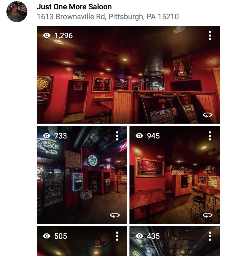 After just a few months, Just One More Saloon in Carrick has generated hundreds to thousands of virtual tour views from Google Maps. These potential customers may have never known the vibe and this neighborhood bar may have missed out on new patrons.